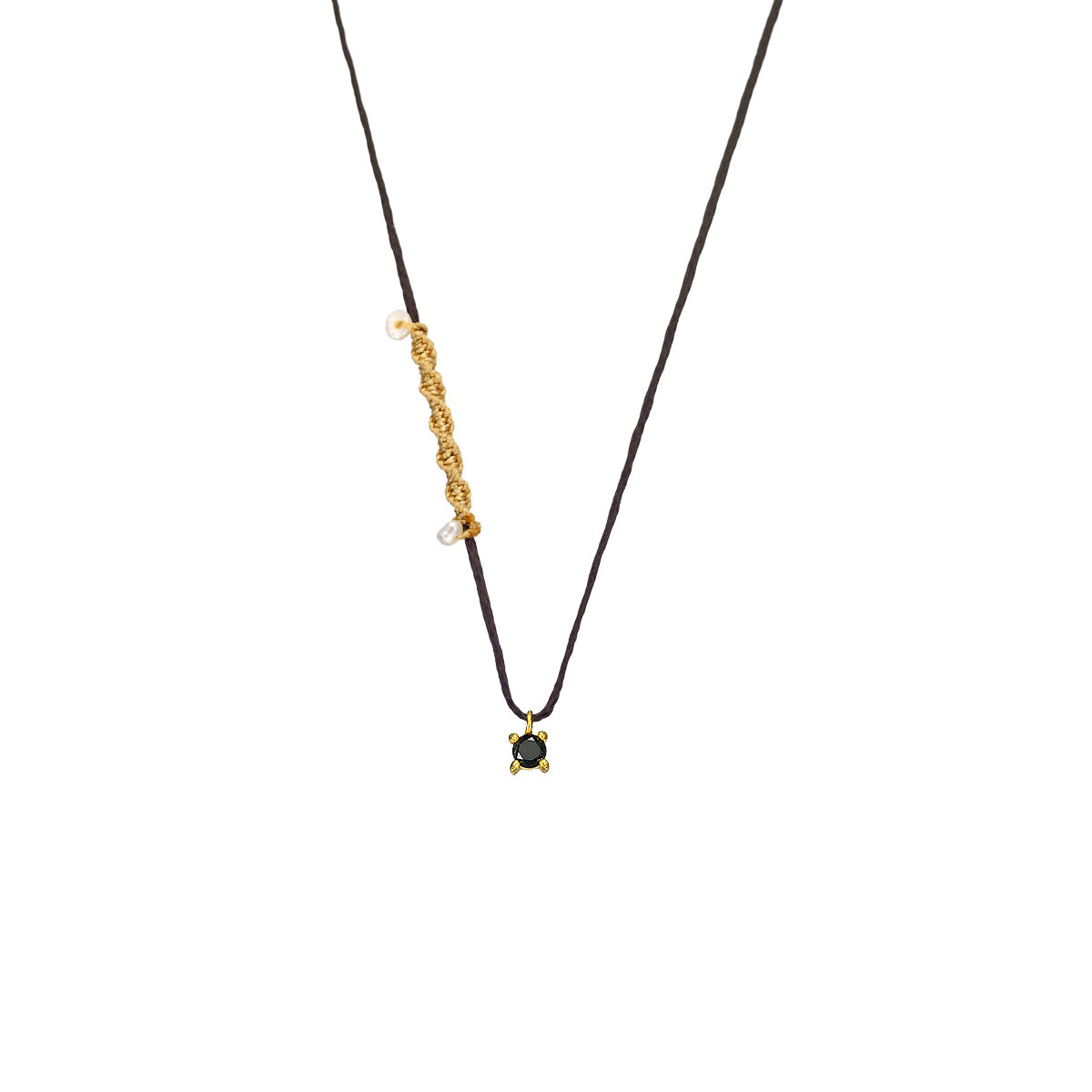 Pendant in yellow gold 14K. Pendant size 0,4cm with wax cord black and decorative knitting, total length 42cm.